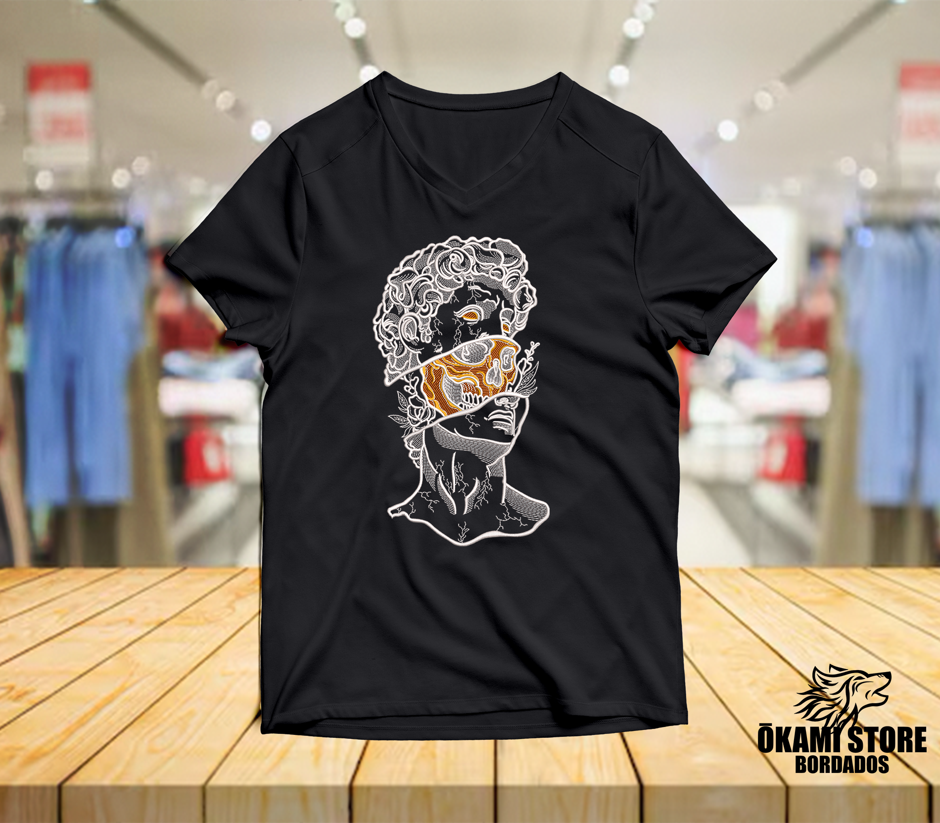Bordado con diseño inspirado en Estatua de David con calavera